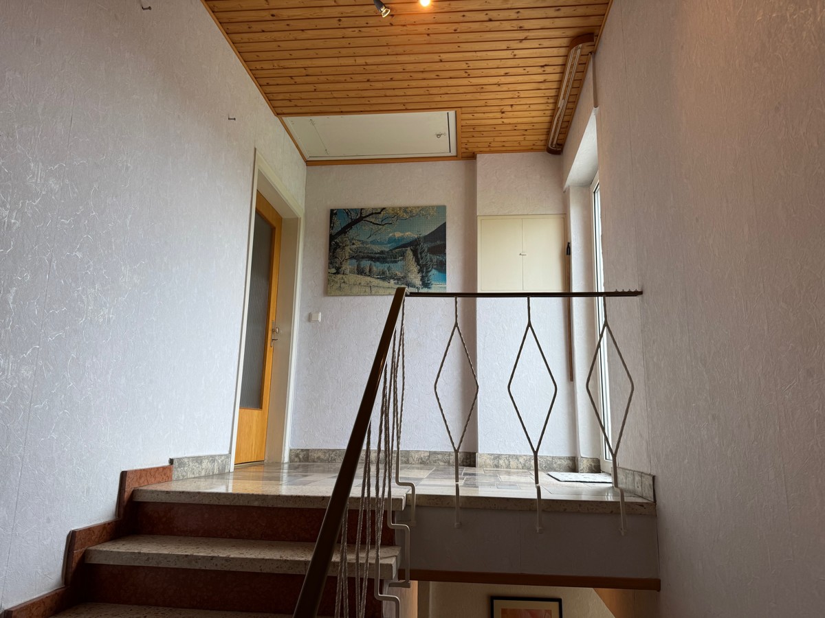 Über die 10-stufige Eingangstreppe gelangen Sie zur Haustür unter der Schleppdach-Eingangsüberdachung. Oder Sie gehen durch die hausinterne Garage oder den Nebeneingang am Außenstellplatz ins Haus.