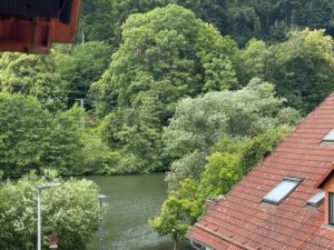Das Fachwerkhaus in Staufenberg-Spiekershausen liegt auf einem 336 m² großen Eckgrundstück an der Hauptstraße. Nur 30 m entfernt: das Fuldaufer und die Fuldaauen. Nur 30 m Luftlinie entfernt: Wald. Bis zur hauseigenen Bootsanlegestelle sind es 650 m Luftlinie.